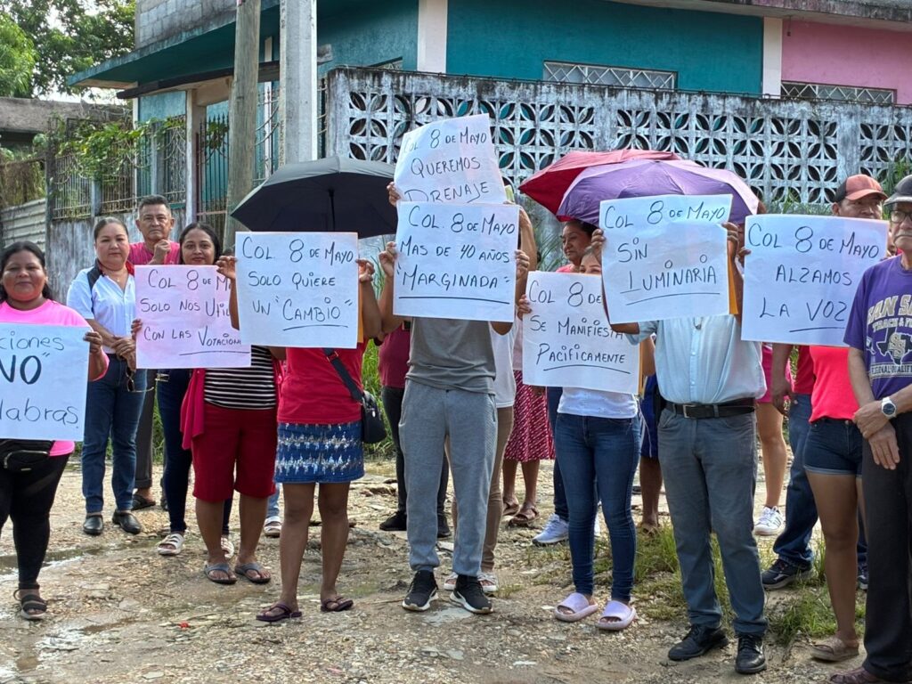 Cansados de promesas incumplidas y de vivir entre el lodo, los vecinos de la colonia 8 de Mayo alzaron la voz para exigir atención al Ayuntamiento de Minatitlán, luego de más de cuatro décadas sin drenaje, sin alumbrado público y con calles intransitables.