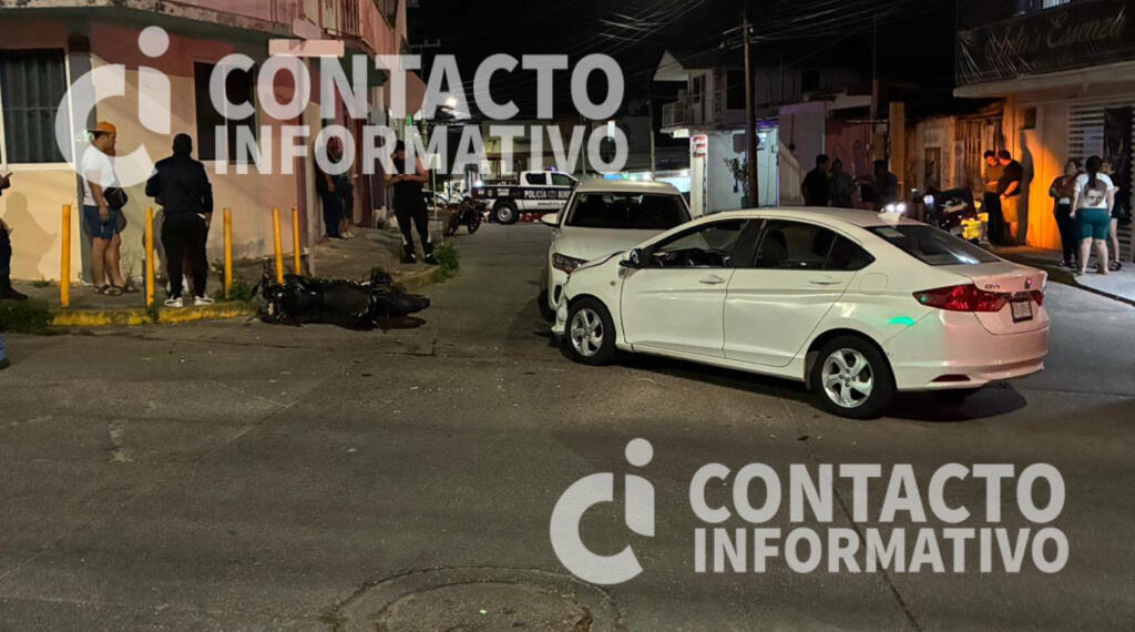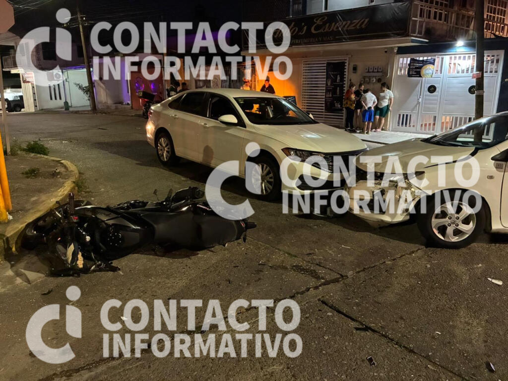 Minatitlán, Ver. La noche del miércoles se registró un aparatoso accidente vial en calles de la colonia Centro, donde un motociclista resultó lesionado tras verse involucrados en una colisión que terminó afectando a tres vehículos.