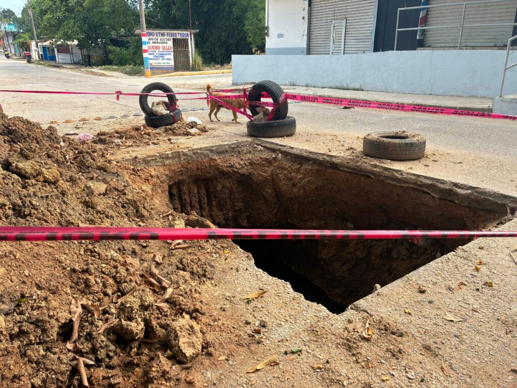 Según relatan los residentes, fue en el mes de enero cuando colapsó una losa ubicada entre las calles Miguel Alemán y San Rafael, dando inicio a una serie de problemas que, lejos de resolverse, se han agravado con el paso del tiempo. Personal municipal acudió a realizar excavaciones en el sitio, pero las labores se detuvieron abruptamente sin explicación, dejando un cráter de aproximadamente dos metros de diámetro y tres de profundidad, encharcado con aguas residuales.