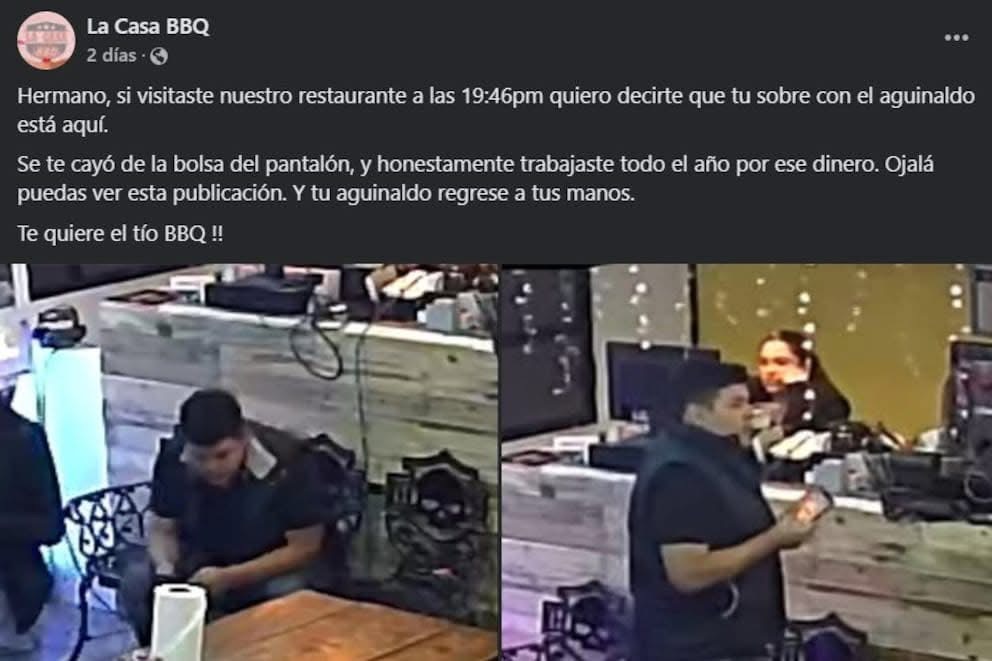 «Hermano, si visitaste nuestro restaurante a las 19:46 pm, quiero decirte que tu sobre con el aguinaldo está aquí. Se te cayó de la bolsa del pantalón y honestamente trabajaste todo el año para ese dinero», dice parte del mensaje que compartieron en redes sociales.