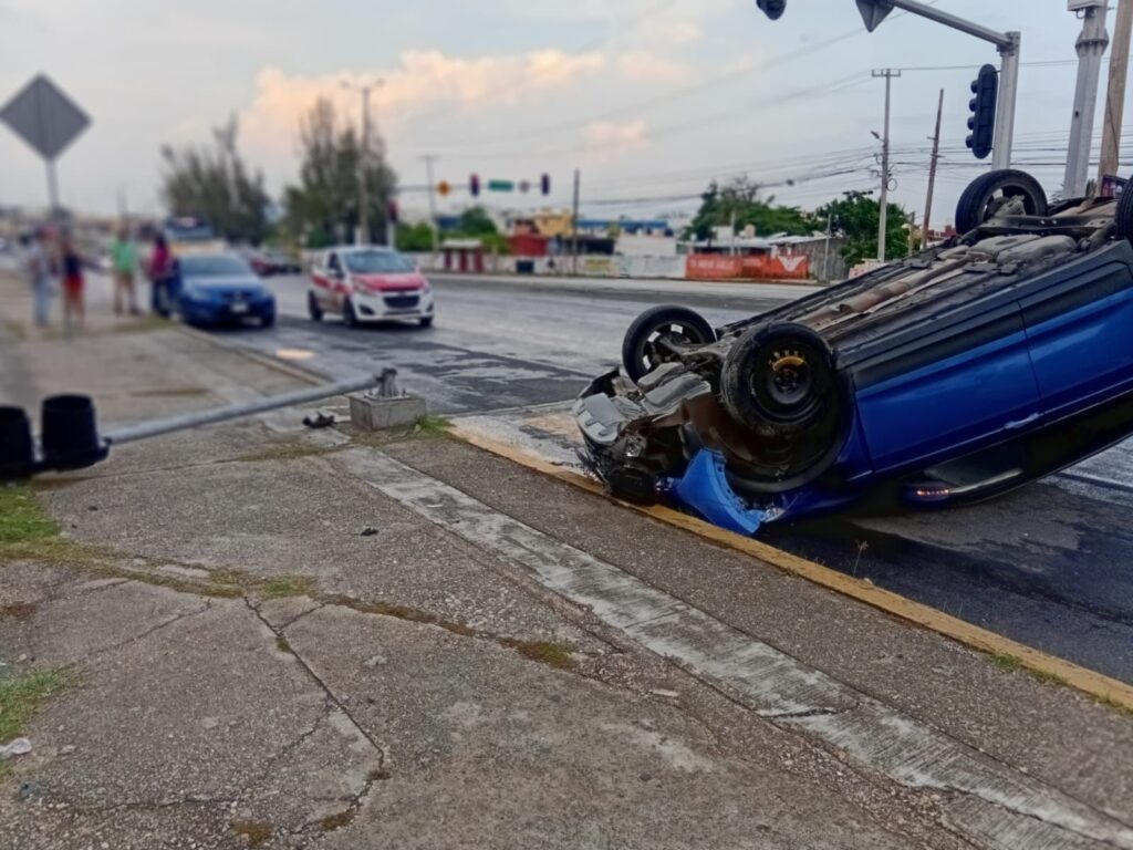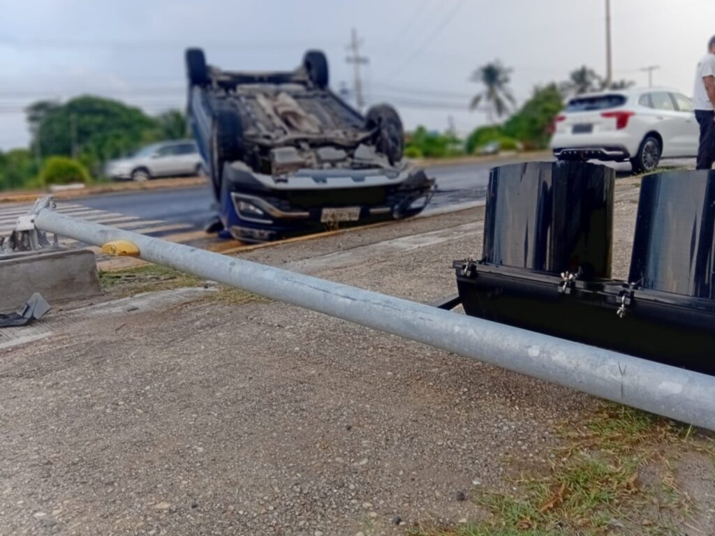 Tras derribar un semáforo peatonal de los nuevos, terminó volcada, mientras que el conductor y sus acompañantes escaparon del lugar.